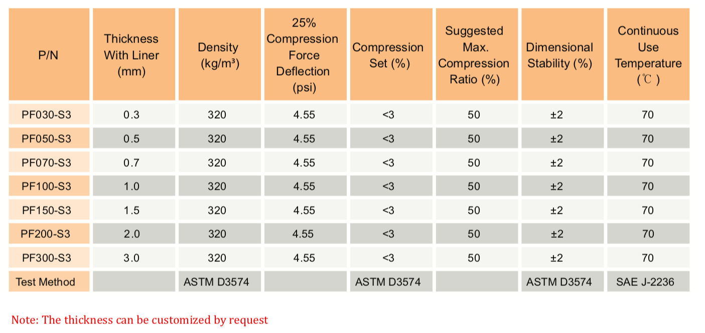 TMPF-S3 系列是一種中等柔軟、快速回彈的泡棉,具有緩震、保護作用 密封和電子設備中的長期間隙填充。S3系列泡棉具有極低的壓縮永久變形、高密封性能和優異的沖擊吸收性能。" />